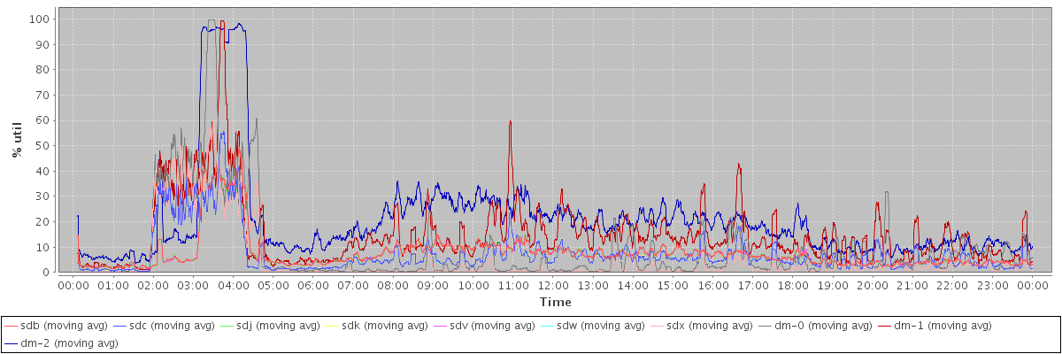 avg(sdb) = 7.68 avg(sdc) = 7.41 avg(sdj) = 7.68 avg(sdk) = 7.40 avg(sdv) = 7.68 avg(sdw) = 7.41 avg(sdx) = 4.93 avg(dm-0) = 8.59 avg(dm-1) = 14.96 avg(dm-2) = 20.75