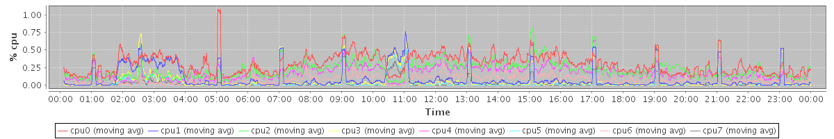 avg(cpu0) = 1.18 avg(cpu1) = 0.80 avg(cpu2) = 0.82 avg(cpu3) = 0.44 avg(cpu4) = 0.66 avg(cpu5) = 0.32 avg(cpu6) = 0.37 avg(cpu7) = 0.32