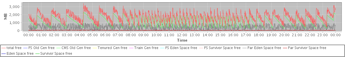 avg(total free) = 1684.92 avg(PS Old Gen free) = 0.00 avg(CMS Old Gen free) = 1165.48 avg(Tenured Gen free) = 0.00 avg(Train Gen free) = 0.00 avg(PS Eden Space free) = 0.00 avg(PS Survivor Space free) = 0.00 avg(Par Eden Space free) = 461.90 avg(Par Survivor Space free) = 57.54 avg(Eden Space free) = 0.00 avg(Survivor Space free) = 0.00