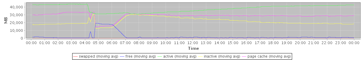 avg(swapped) = 1.38 avg(free) = 2233.24 avg(active) = 38039.17 avg(inactive) = 21667.53 avg(page cache) = 28657.00