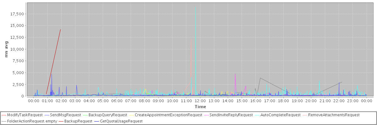 avg(ModifyTaskRequest) = 238.00 avg(SendMsgRequest) = 206.37 avg(BackupQueryRequest) = 298.40 avg(CreateAppointmentExceptionRequest) = 322.03 avg(SendInviteReplyRequest) = 376.16 avg(AutoCompleteRequest) = 349.30 avg(RemoveAttachmentsRequest) = 1762.18 avg(FolderActionRequest.empty) = 518.97 avg(BackupRequest) = 7314.00 avg(GetQuotaUsageRequest) = 1463.00
