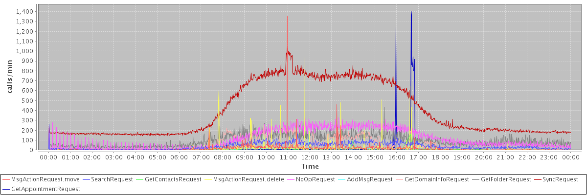 max(MsgActionRequest.move) = 1349.00 max(SearchRequest) = 260.00 max(GetContactsRequest) = 157.00 max(MsgActionRequest.delete) = 959.00 max(NoOpRequest) = 332.00 max(AddMsgRequest) = 185.00 max(GetDomainInfoRequest) = 231.00 max(GetFolderRequest) = 429.00 max(SyncRequest) = 1046.00 max(GetAppointmentRequest) = 1406.00