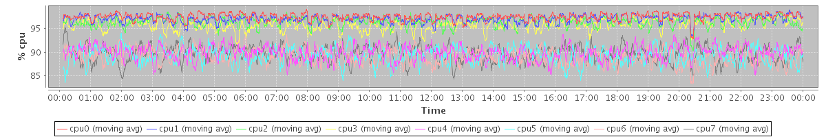 avg(cpu0) = 97.50 avg(cpu1) = 97.08 avg(cpu2) = 96.43 avg(cpu3) = 95.84 avg(cpu4) = 89.90 avg(cpu5) = 89.30 avg(cpu6) = 89.08 avg(cpu7) = 89.68