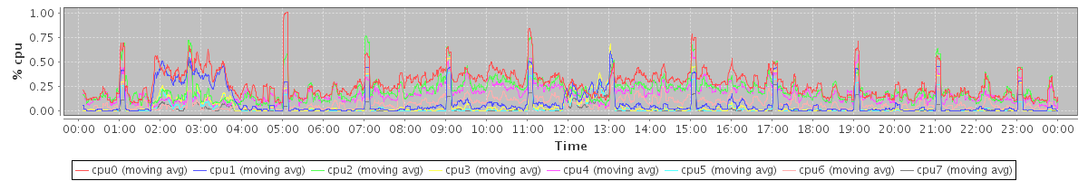 avg(cpu0) = 1.05 avg(cpu1) = 0.75 avg(cpu2) = 0.75 avg(cpu3) = 0.46 avg(cpu4) = 0.63 avg(cpu5) = 0.36 avg(cpu6) = 0.38 avg(cpu7) = 0.28