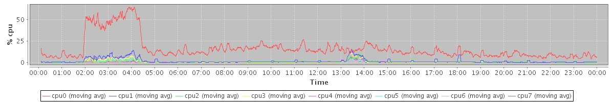 avg(cpu0) = 1.21 avg(cpu1) = 0.65 avg(cpu2) = 0.81 avg(cpu3) = 0.46 avg(cpu4) = 0.67 avg(cpu5) = 0.36 avg(cpu6) = 0.44 avg(cpu7) = 0.30