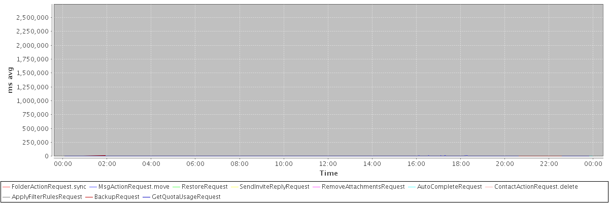 avg(FolderActionRequest.sync) = 646.50 avg(MsgActionRequest.move) = 505.13 avg(RestoreRequest) = 2612367.00 avg(SendInviteReplyRequest) = 386.26 avg(RemoveAttachmentsRequest) = 1136.67 avg(AutoCompleteRequest) = 373.93 avg(ContactActionRequest.delete) = 582.67 avg(ApplyFilterRulesRequest) = 1988.57 avg(BackupRequest) = 7759.00 avg(GetQuotaUsageRequest) = 2321.00