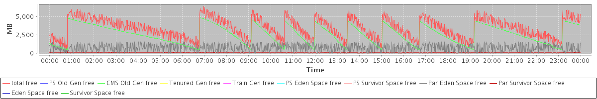 avg(total free) = 3467.27 avg(PS Old Gen free) = 0.00 avg(CMS Old Gen free) = 2590.20 avg(Tenured Gen free) = 0.00 avg(Train Gen free) = 0.00 avg(PS Eden Space free) = 0.00 avg(PS Survivor Space free) = 0.00 avg(Par Eden Space free) = 787.18 avg(Par Survivor Space free) = 89.89 avg(Eden Space free) = 0.00 avg(Survivor Space free) = 0.00