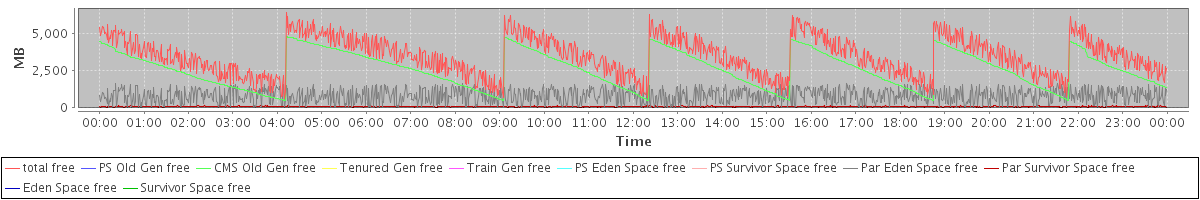 avg(total free) = 3466.29 avg(PS Old Gen free) = 0.00 avg(CMS Old Gen free) = 2577.05 avg(Tenured Gen free) = 0.00 avg(Train Gen free) = 0.00 avg(PS Eden Space free) = 0.00 avg(PS Survivor Space free) = 0.00 avg(Par Eden Space free) = 802.21 avg(Par Survivor Space free) = 87.03 avg(Eden Space free) = 0.00 avg(Survivor Space free) = 0.00