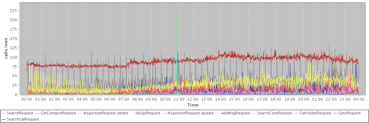 max(SearchRequest) = 79.00 max(GetContactsRequest) = 113.00 max(MsgActionRequest.delete) = 235.00 max(NoOpRequest) = 90.00 max(MsgActionRequest.update) = 40.00 max(AddMsgRequest) = 142.00 max(SearchConvRequest) = 38.00 max(GetFolderRequest) = 133.00 max(SyncRequest) = 121.00 max(SearchGalRequest) = 83.00