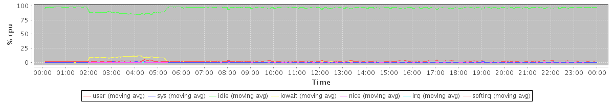 avg(user) = 2.24 avg(sys) = 0.40 avg(idle) = 95.43 avg(iowait) = 1.80 avg(nice) = 0.10 avg(irq) = 0.00 avg(softirq) = 0.04