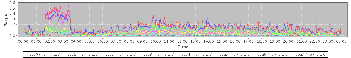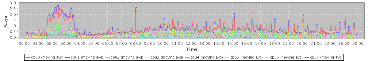 avg(cpu0) = 0.11 avg(cpu1) = 0.13 avg(cpu2) = 0.03 avg(cpu3) = 0.03 avg(cpu4) = 0.02 avg(cpu5) = 0.03 avg(cpu6) = 0.02 avg(cpu7) = 0.02