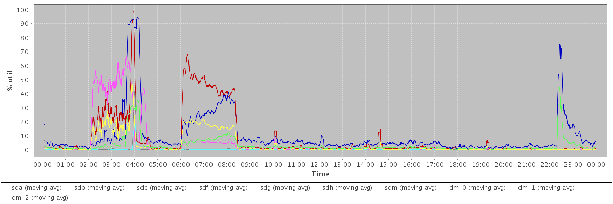 avg(sda) = 0.01 avg(sdb) = 0.01 avg(sde) = 3.37 avg(sdf) = 3.65 avg(sdg) = 4.90 avg(sdh) = 0.21 avg(sdm) = 3.40 avg(dm-0) = 0.55 avg(dm-1) = 8.32 avg(dm-2) = 10.07