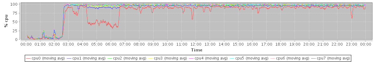 avg(cpu0) = 9.40 avg(cpu1) = 0.88 avg(cpu2) = 0.19 avg(cpu3) = 0.46 avg(cpu4) = 0.11 avg(cpu5) = 0.24 avg(cpu6) = 0.12 avg(cpu7) = 0.18