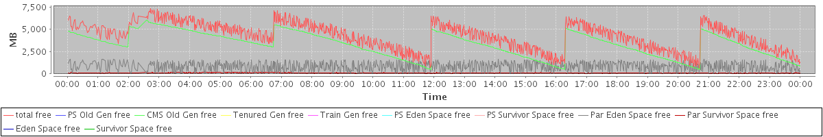 avg(total free) = 4173.09 avg(PS Old Gen free) = 0.00 avg(CMS Old Gen free) = 3234.29 avg(Tenured Gen free) = 0.00 avg(Train Gen free) = 0.00 avg(PS Eden Space free) = 0.00 avg(PS Survivor Space free) = 0.00 avg(Par Eden Space free) = 837.37 avg(Par Survivor Space free) = 101.43 avg(Eden Space free) = 0.00 avg(Survivor Space free) = 0.00