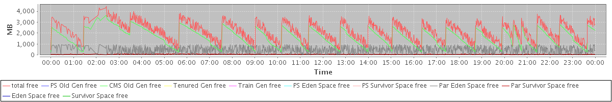 avg(total free) = 2173.47 avg(PS Old Gen free) = 0.00 avg(CMS Old Gen free) = 1621.16 avg(Tenured Gen free) = 0.00 avg(Train Gen free) = 0.00 avg(PS Eden Space free) = 0.00 avg(PS Survivor Space free) = 0.00 avg(Par Eden Space free) = 485.29 avg(Par Survivor Space free) = 67.02 avg(Eden Space free) = 0.00 avg(Survivor Space free) = 0.00