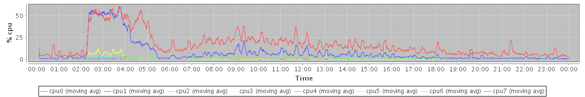 avg(cpu0) = 1.08 avg(cpu1) = 0.91 avg(cpu2) = 0.69 avg(cpu3) = 0.38 avg(cpu4) = 0.57 avg(cpu5) = 0.28 avg(cpu6) = 0.34 avg(cpu7) = 0.22