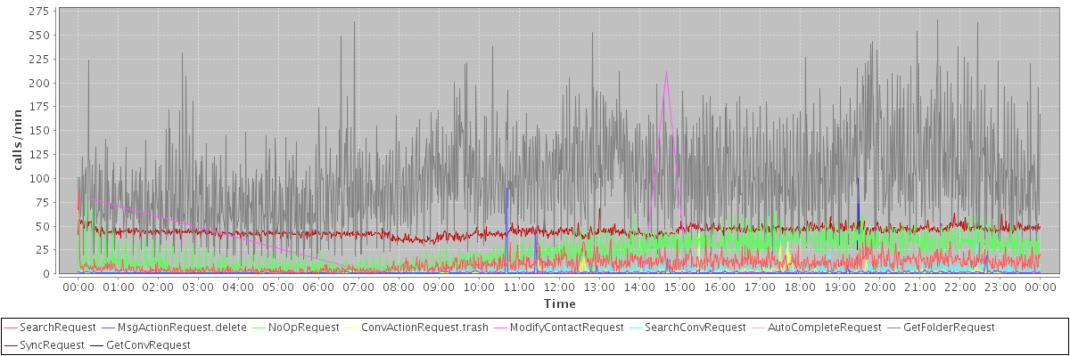 max(SearchRequest) = 87.00 max(MsgActionRequest.delete) = 90.00 max(NoOpRequest) = 83.00 max(ConvActionRequest.trash) = 42.00 max(ModifyContactRequest) = 212.00 max(SearchConvRequest) = 48.00 max(AutoCompleteRequest) = 41.00 max(GetFolderRequest) = 266.00 max(SyncRequest) = 68.00 max(GetConvRequest) = 100.00