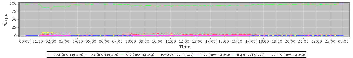 avg(user) = 2.96 avg(sys) = 0.51 avg(idle) = 94.93 avg(iowait) = 1.42 avg(nice) = 0.10 avg(irq) = 0.00 avg(softirq) = 0.07