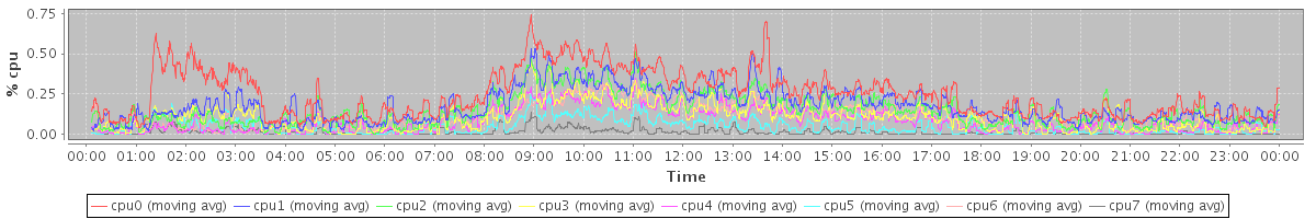 avg(cpu0) = 1.06 avg(cpu1) = 0.86 avg(cpu2) = 0.60 avg(cpu3) = 0.52 avg(cpu4) = 0.42 avg(cpu5) = 0.31 avg(cpu6) = 0.58 avg(cpu7) = 0.25