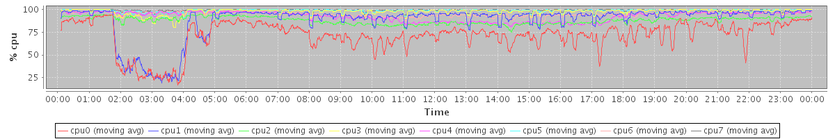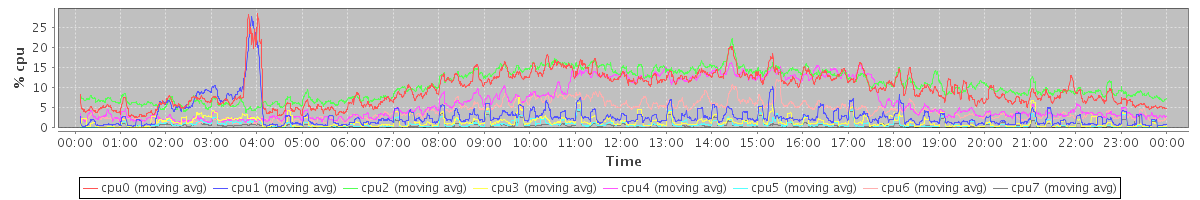 avg(cpu0) = 17.40 avg(cpu1) = 8.32 avg(cpu2) = 0.71 avg(cpu3) = 0.62 avg(cpu4) = 0.48 avg(cpu5) = 0.24 avg(cpu6) = 0.26 avg(cpu7) = 0.10