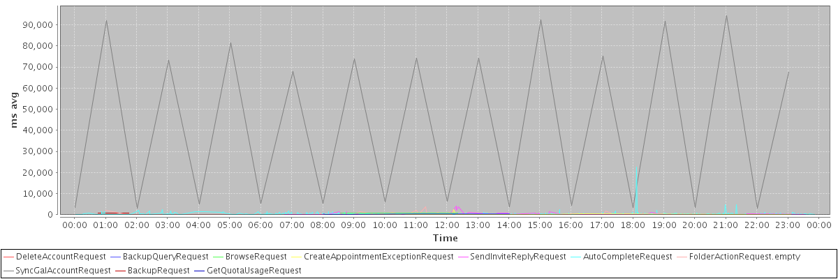 avg(DeleteAccountRequest) = 29702.00 avg(BackupQueryRequest) = 356.40 avg(BrowseRequest) = 773.00 avg(CreateAppointmentExceptionRequest) = 323.54 avg(SendInviteReplyRequest) = 411.71 avg(AutoCompleteRequest) = 317.76 avg(FolderActionRequest.empty) = 318.43 avg(SyncGalAccountRequest) = 42076.79 avg(BackupRequest) = 667.50 avg(GetQuotaUsageRequest) = 1239.00