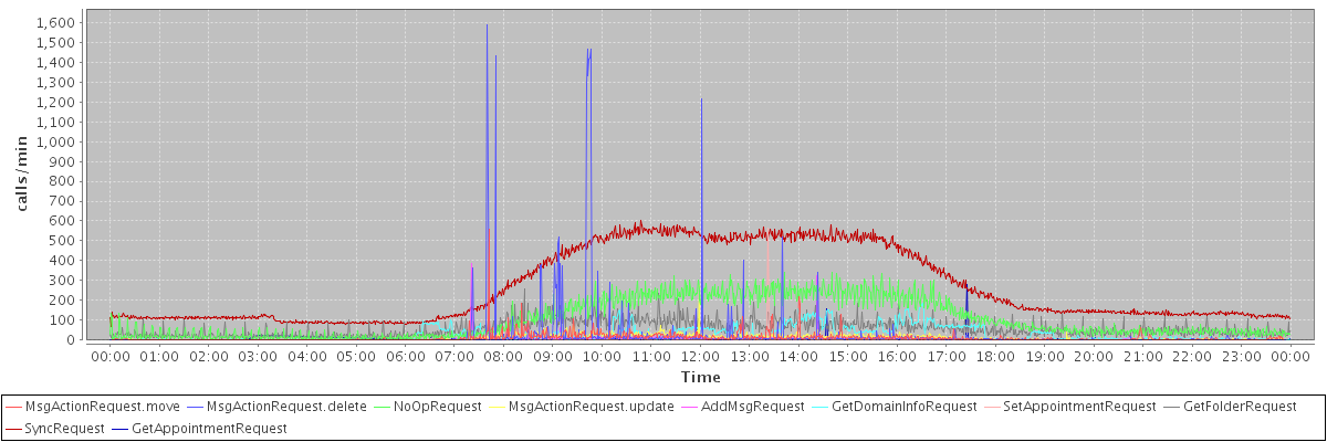 max(MsgActionRequest.move) = 557.00 max(MsgActionRequest.delete) = 1589.00 max(NoOpRequest) = 342.00 max(MsgActionRequest.update) = 273.00 max(AddMsgRequest) = 385.00 max(GetDomainInfoRequest) = 186.00 max(SetAppointmentRequest) = 562.00 max(GetFolderRequest) = 260.00 max(SyncRequest) = 604.00 max(GetAppointmentRequest) = 282.00