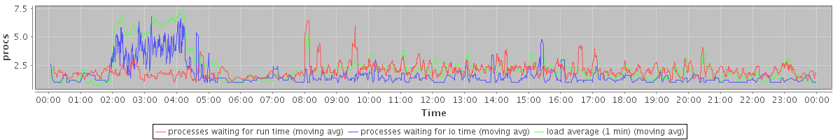 avg(processes waiting for run time) = 1.37 avg(processes waiting for io time) = 0.84 avg(load average (1 min)) = 2.30
