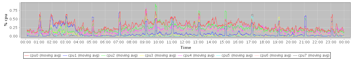 avg(cpu0) = 1.11 avg(cpu1) = 0.74 avg(cpu2) = 0.68 avg(cpu3) = 0.39 avg(cpu4) = 0.61 avg(cpu5) = 0.29 avg(cpu6) = 0.53 avg(cpu7) = 0.24