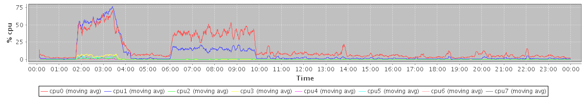 avg(cpu0) = 0.25 avg(cpu1) = 0.07 avg(cpu2) = 0.16 avg(cpu3) = 0.05 avg(cpu4) = 0.13 avg(cpu5) = 0.03 avg(cpu6) = 0.09 avg(cpu7) = 0.01