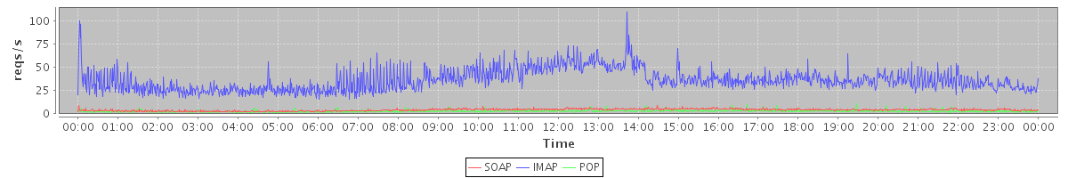 Host zm04.stanford.edu: Mailboxd: Request Rate by Client Protocol