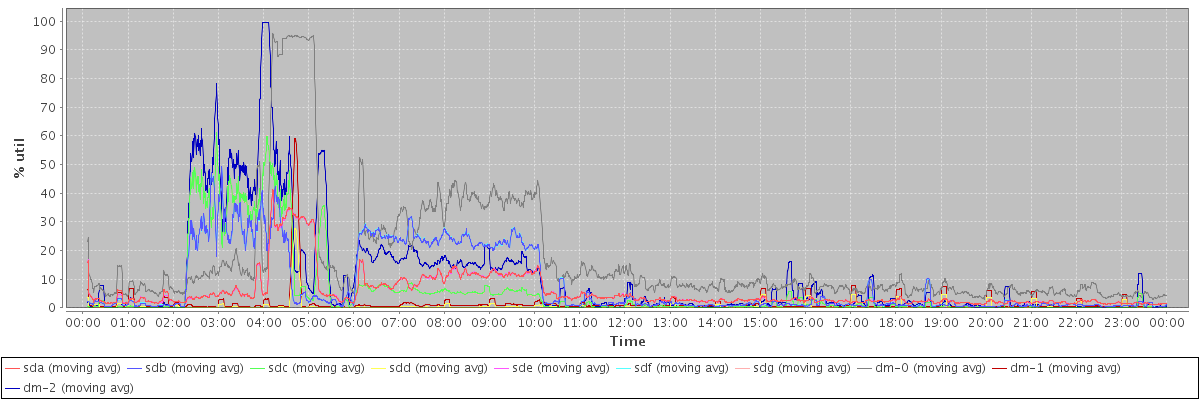 avg(sda) = 5.53 avg(sdb) = 8.00 avg(sdc) = 5.72 avg(sdd) = 0.60 avg(sde) = 5.49 avg(sdf) = 8.02 avg(sdg) = 5.71 avg(dm-0) = 16.58 avg(dm-1) = 1.42 avg(dm-2) = 10.17