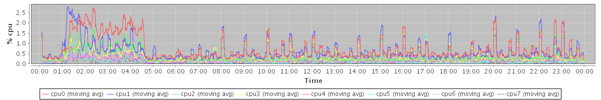 avg(cpu0) = 0.18 avg(cpu1) = 0.21 avg(cpu2) = 0.04 avg(cpu3) = 0.07 avg(cpu4) = 0.04 avg(cpu5) = 0.05 avg(cpu6) = 0.02 avg(cpu7) = 0.03