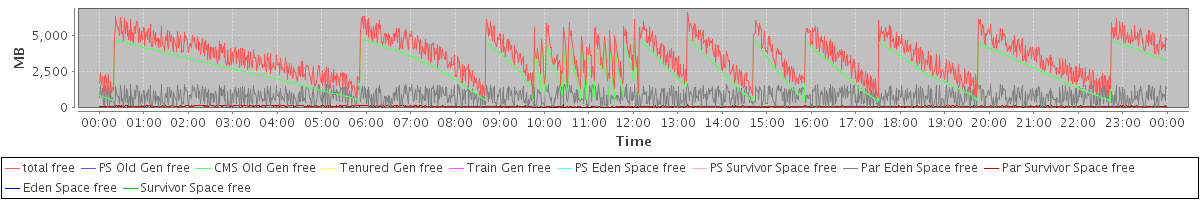 avg(total free) = 3587.24 avg(PS Old Gen free) = 0.00 avg(CMS Old Gen free) = 2686.64 avg(Tenured Gen free) = 0.00 avg(Train Gen free) = 0.00 avg(PS Eden Space free) = 0.00 avg(PS Survivor Space free) = 0.00 avg(Par Eden Space free) = 799.84 avg(Par Survivor Space free) = 100.75 avg(Eden Space free) = 0.00 avg(Survivor Space free) = 0.00