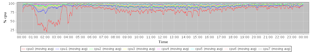 avg(cpu0) = 80.12 avg(cpu1) = 91.38 avg(cpu2) = 94.19 avg(cpu3) = 95.45 avg(cpu4) = 96.48 avg(cpu5) = 97.72 avg(cpu6) = 95.12 avg(cpu7) = 98.63