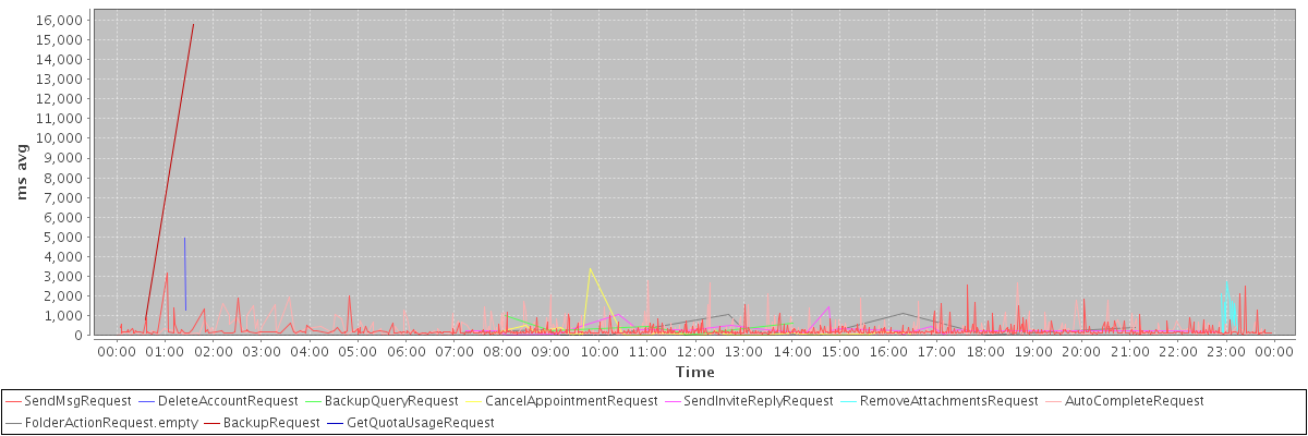 avg(SendMsgRequest) = 228.41 avg(DeleteAccountRequest) = 3114.00 avg(BackupQueryRequest) = 418.17 avg(CancelAppointmentRequest) = 180.50 avg(SendInviteReplyRequest) = 303.58 avg(RemoveAttachmentsRequest) = 1113.65 avg(AutoCompleteRequest) = 287.47 avg(FolderActionRequest.empty) = 257.14 avg(BackupRequest) = 8292.00 avg(GetQuotaUsageRequest) = 2511.00