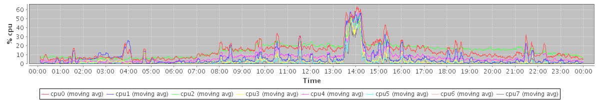 avg(cpu0) = 14.16 avg(cpu1) = 6.78 avg(cpu2) = 14.86 avg(cpu3) = 3.51 avg(cpu4) = 7.53 avg(cpu5) = 2.74 avg(cpu6) = 6.48 avg(cpu7) = 2.05