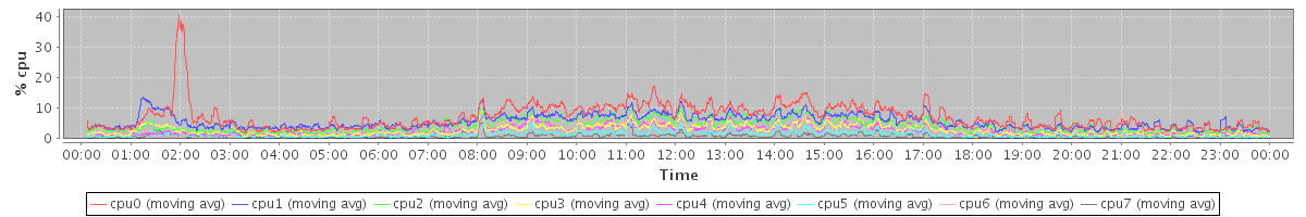 avg(cpu0) = 10.01 avg(cpu1) = 0.94 avg(cpu2) = 0.39 avg(cpu3) = 0.36 avg(cpu4) = 0.17 avg(cpu5) = 0.09 avg(cpu6) = 0.16 avg(cpu7) = 0.04