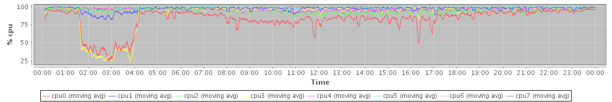 avg(cpu0) = 10.45 avg(cpu1) = 0.72 avg(cpu2) = 0.29 avg(cpu3) = 7.03 avg(cpu4) = 0.15 avg(cpu5) = 0.29 avg(cpu6) = 0.04 avg(cpu7) = 0.09