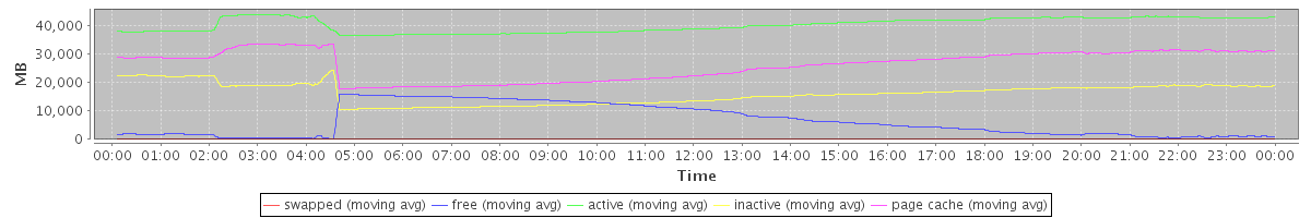 avg(swapped) = 4.67 avg(free) = 6397.45 avg(active) = 40075.85 avg(inactive) = 16036.90 avg(page cache) = 26113.77