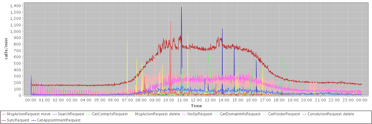 max(MsgActionRequest.move) = 1150.00 max(SearchRequest) = 311.00 max(GetContactsRequest) = 652.00 max(MsgActionRequest.delete) = 962.00 max(NoOpRequest) = 351.00 max(GetDomainInfoRequest) = 177.00 max(GetFolderRequest) = 702.00 max(ConvActionRequest.delete) = 110.00 max(SyncRequest) = 935.00 max(GetAppointmentRequest) = 1382.00