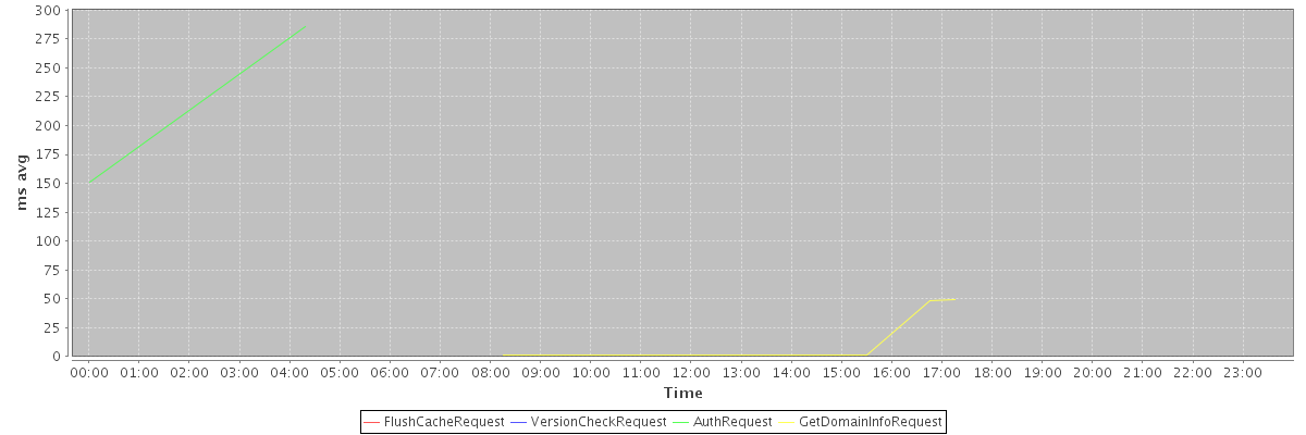 avg(FlushCacheRequest) = 59.00 avg(VersionCheckRequest) = 287.00 avg(AuthRequest) = 218.50 avg(GetDomainInfoRequest) = 0.91