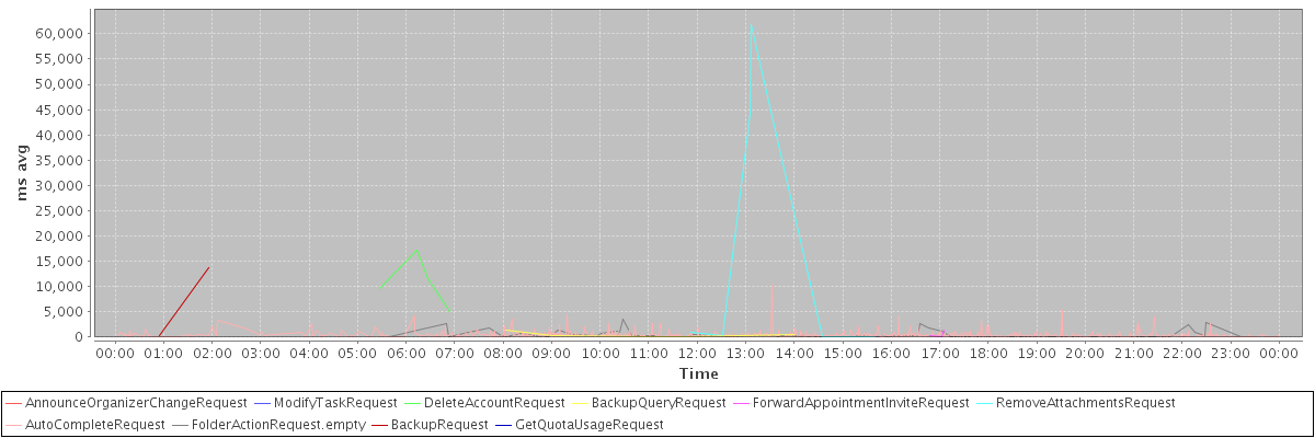 avg(AnnounceOrganizerChangeRequest) = 443.00 avg(ModifyTaskRequest) = 558.00 avg(DeleteAccountRequest) = 10836.75 avg(BackupQueryRequest) = 484.60 avg(ForwardAppointmentInviteRequest) = 588.33 avg(RemoveAttachmentsRequest) = 17919.17 avg(AutoCompleteRequest) = 415.44 avg(FolderActionRequest.empty) = 621.55 avg(BackupRequest) = 6990.00 avg(GetQuotaUsageRequest) = 4379.00