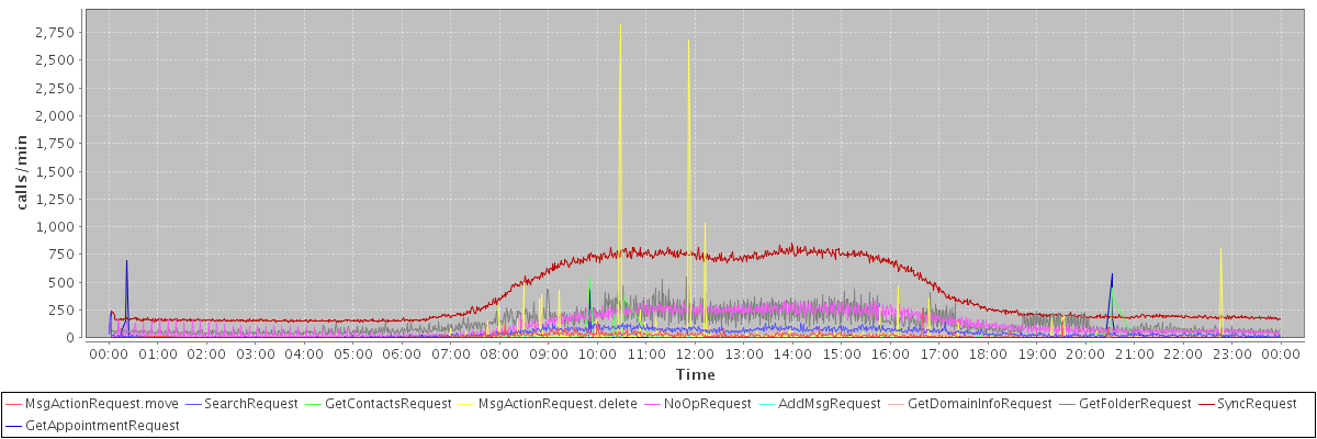 max(MsgActionRequest.move) = 258.00 max(SearchRequest) = 220.00 max(GetContactsRequest) = 549.00 max(MsgActionRequest.delete) = 2823.00 max(NoOpRequest) = 336.00 max(AddMsgRequest) = 130.00 max(GetDomainInfoRequest) = 141.00 max(GetFolderRequest) = 548.00 max(SyncRequest) = 856.00 max(GetAppointmentRequest) = 695.00