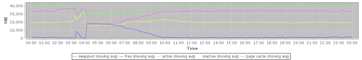 avg(swapped) = 1.38 avg(free) = 3748.53 avg(active) = 38406.00 avg(inactive) = 19852.68 avg(page cache) = 31413.92