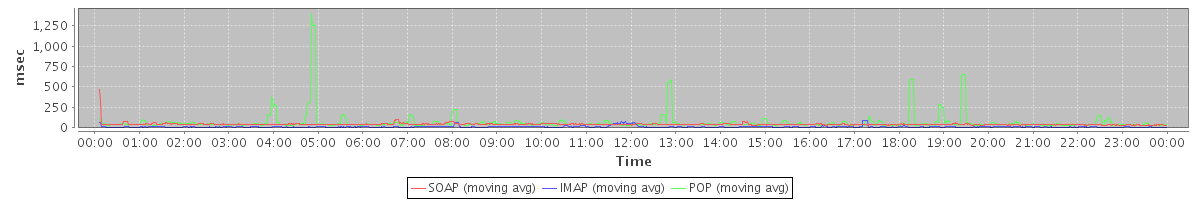max(ModifyContactRequest) = 82.00 max(MsgActionRequest.move) = 29.00 max(SearchConvRequest) = 33.00 max(GetFolderRequest) = 151.00 max(SearchRequest) = 96.00 max(MsgActionRequest.delete) = 1366.00 max(NoOpRequest) = 81.00 max(SyncRequest) = 78.00 max(GetEffectiveFolderPermsRequest) = 21.00 max(AddMsgRequest) = 55.00