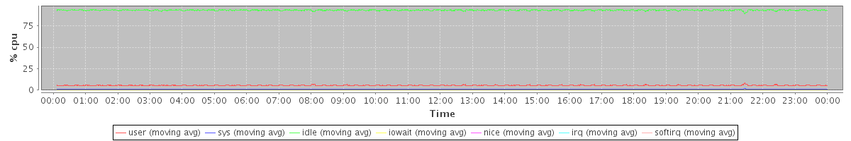 avg(user) = 5.48 avg(sys) = 0.93 avg(idle) = 93.19 avg(iowait) = 0.11 avg(nice) = 0.30 avg(irq) = 0.00 avg(softirq) = 0.00