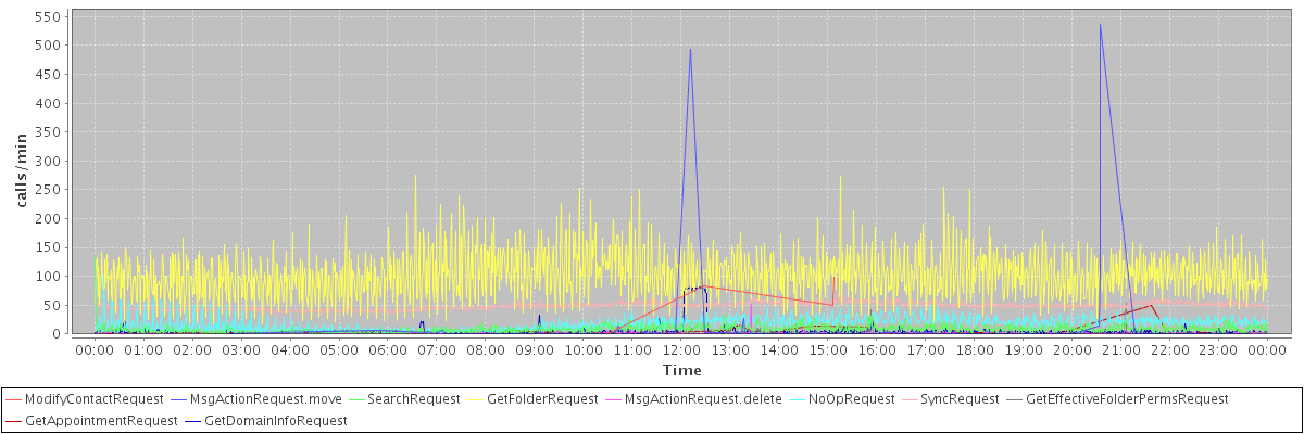 max(ModifyContactRequest) = 99.00 max(MsgActionRequest.move) = 537.00 max(SearchRequest) = 133.00 max(GetFolderRequest) = 275.00 max(MsgActionRequest.delete) = 51.00 max(NoOpRequest) = 103.00 max(SyncRequest) = 79.00 max(GetEffectiveFolderPermsRequest) = 53.00 max(GetAppointmentRequest) = 49.00 max(GetDomainInfoRequest) = 83.00