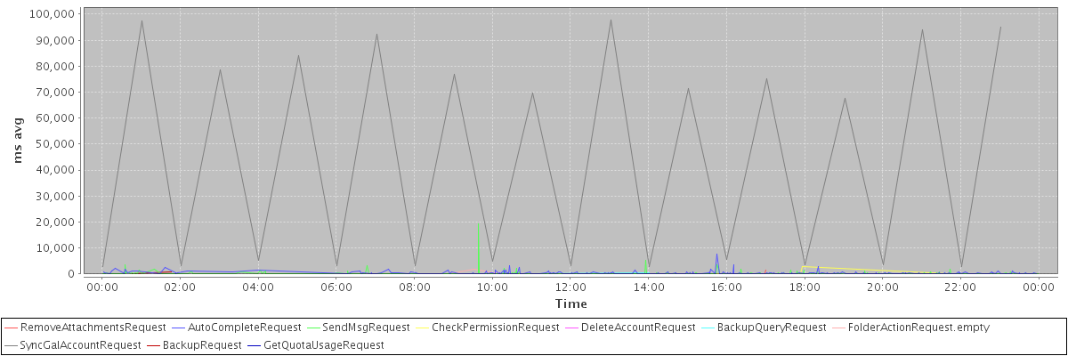 avg(RemoveAttachmentsRequest) = 974.00 avg(AutoCompleteRequest) = 282.43 avg(SendMsgRequest) = 206.29 avg(CheckPermissionRequest) = 184.13 avg(DeleteAccountRequest) = 20335.00 avg(BackupQueryRequest) = 278.50 avg(FolderActionRequest.empty) = 175.58 avg(SyncGalAccountRequest) = 43497.62 avg(BackupRequest) = 489.50 avg(GetQuotaUsageRequest) = 1221.00