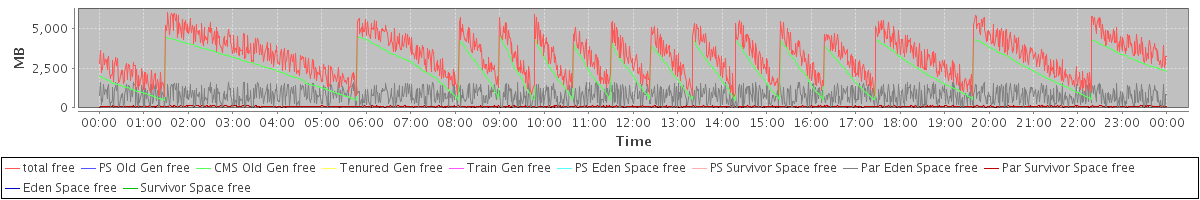 avg(total free) = 3282.19 avg(PS Old Gen free) = 0.00 avg(CMS Old Gen free) = 2408.37 avg(Tenured Gen free) = 0.00 avg(Train Gen free) = 0.00 avg(PS Eden Space free) = 0.00 avg(PS Survivor Space free) = 0.00 avg(Par Eden Space free) = 784.18 avg(Par Survivor Space free) = 89.63 avg(Eden Space free) = 0.00 avg(Survivor Space free) = 0.00