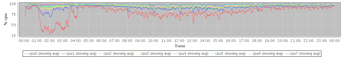 avg(cpu0) = 79.93 avg(cpu1) = 91.25 avg(cpu2) = 93.96 avg(cpu3) = 95.19 avg(cpu4) = 96.09 avg(cpu5) = 97.54 avg(cpu6) = 95.10 avg(cpu7) = 98.70